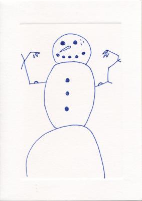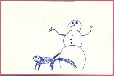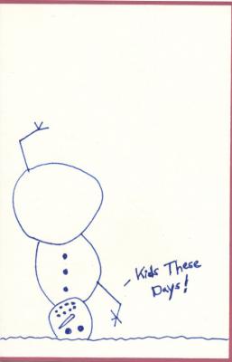 Clearly, this card was targeted for someone old. Pictured here is the mischievous work of some young ragamuffin rapscallions. Who pays for this recklessness? Not the guilty rogues behind the antics, but the helpless snowman himself.